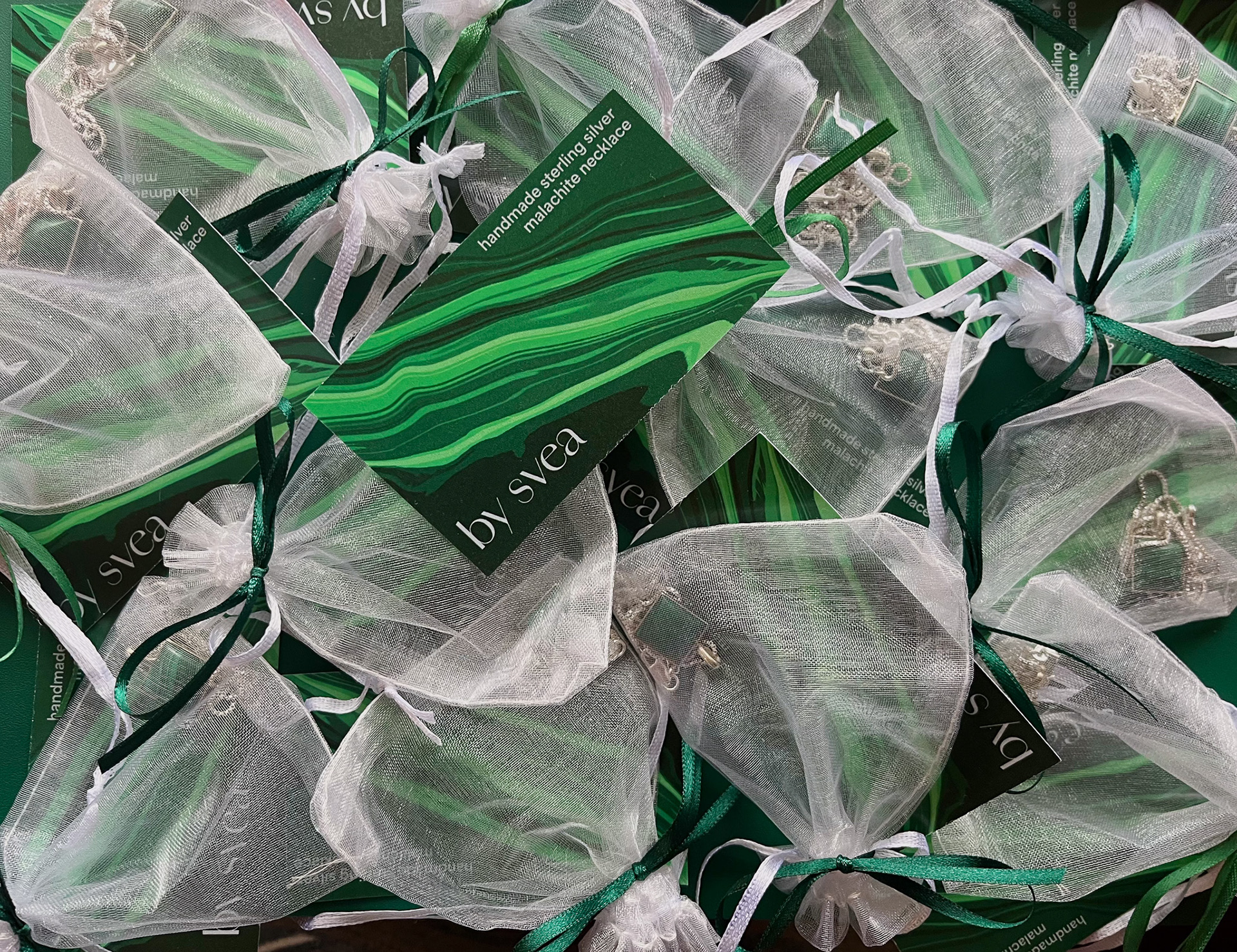 Designed information cards for her handmade malachite necklaces
